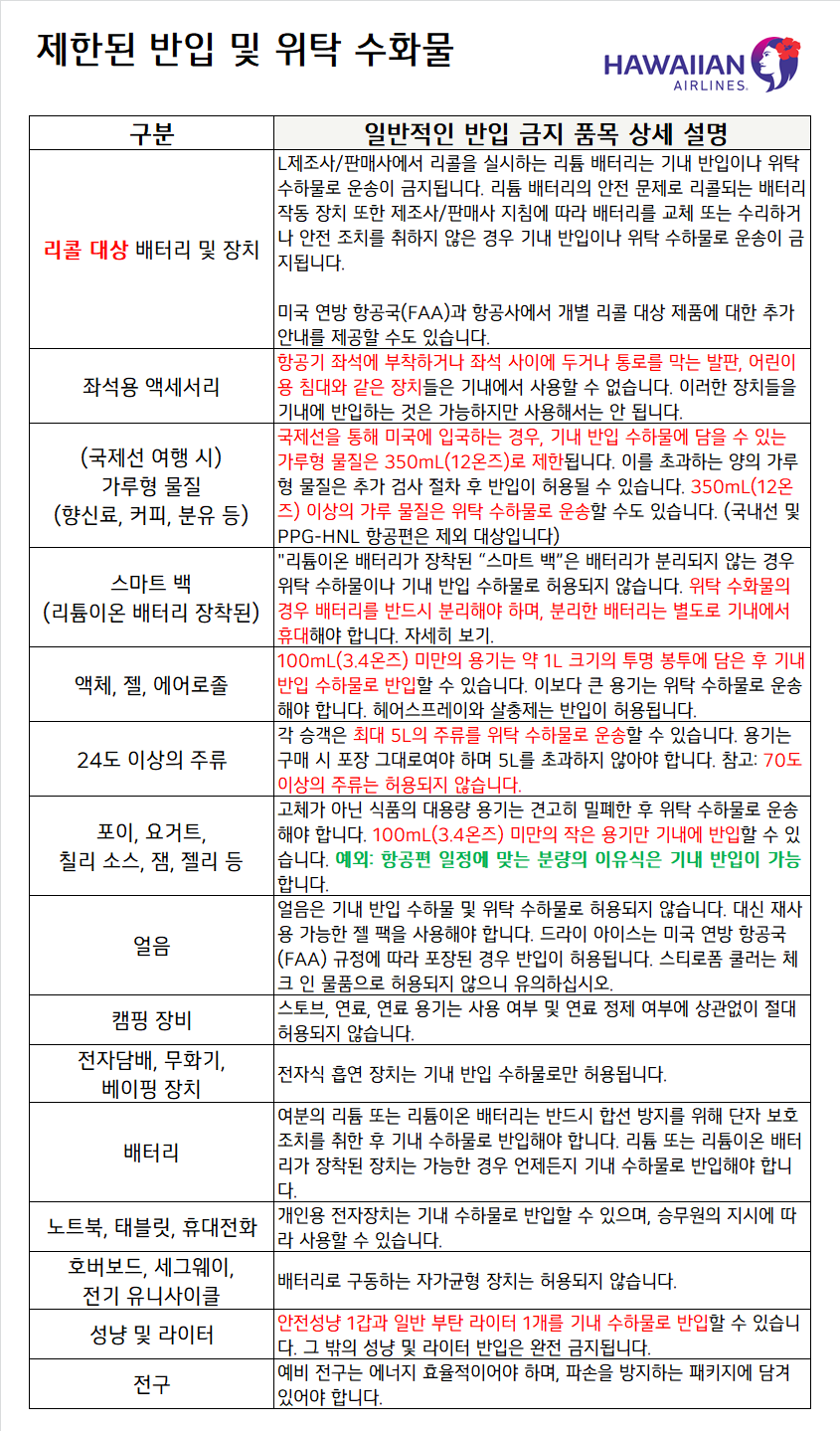 위의 이미지는 제가 이 글을 쓰려고 모두 만든 이미지입니다.(하와이안 항공 홈페이지보다 이 글이 더 나은 것 같아요.) 좋아요라도 꼭 눌러주세요! :) 행복한 여행되시고, 수화물이나 반입 기준 때문에 스트레스 받지 않으셨으면 좋겠습니다. 가볍게 가셔도 하와이에 월마트 가시면 한국에서 쓰던 제품들 다 있습니다. 가볍게 가시는 것을 추천드립니다. 아름다운 추억 많이 만드세요. 감사합니다.